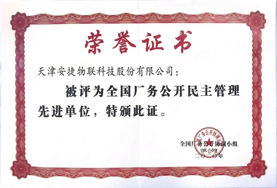 近日,天津今年会jinnianhui物联科技股份有限公司被全国厂务公开协调小组授予“全国厂务公开民主管理先进单位”称号。